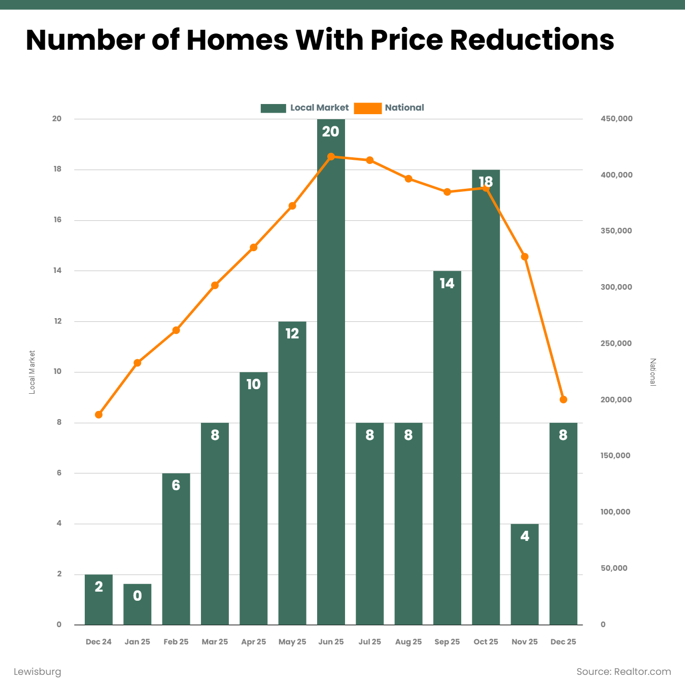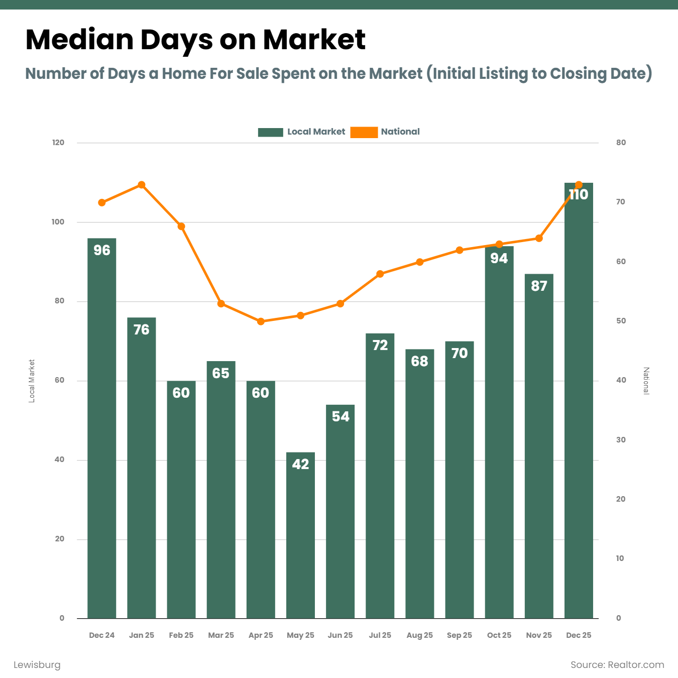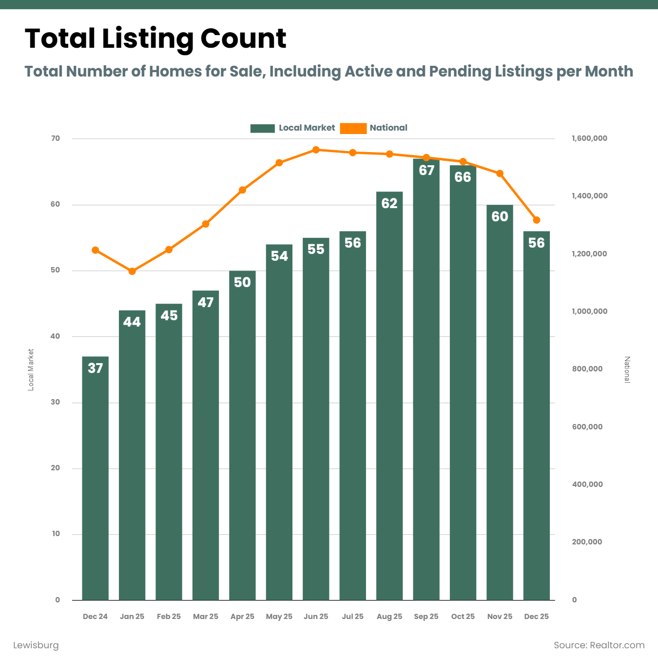 Total listings dipped in December, which is typical for this time of year and mirrors national seasonal patterns. Even so, Lewisburg ended 2025 with 34% more homes available than December 2024.