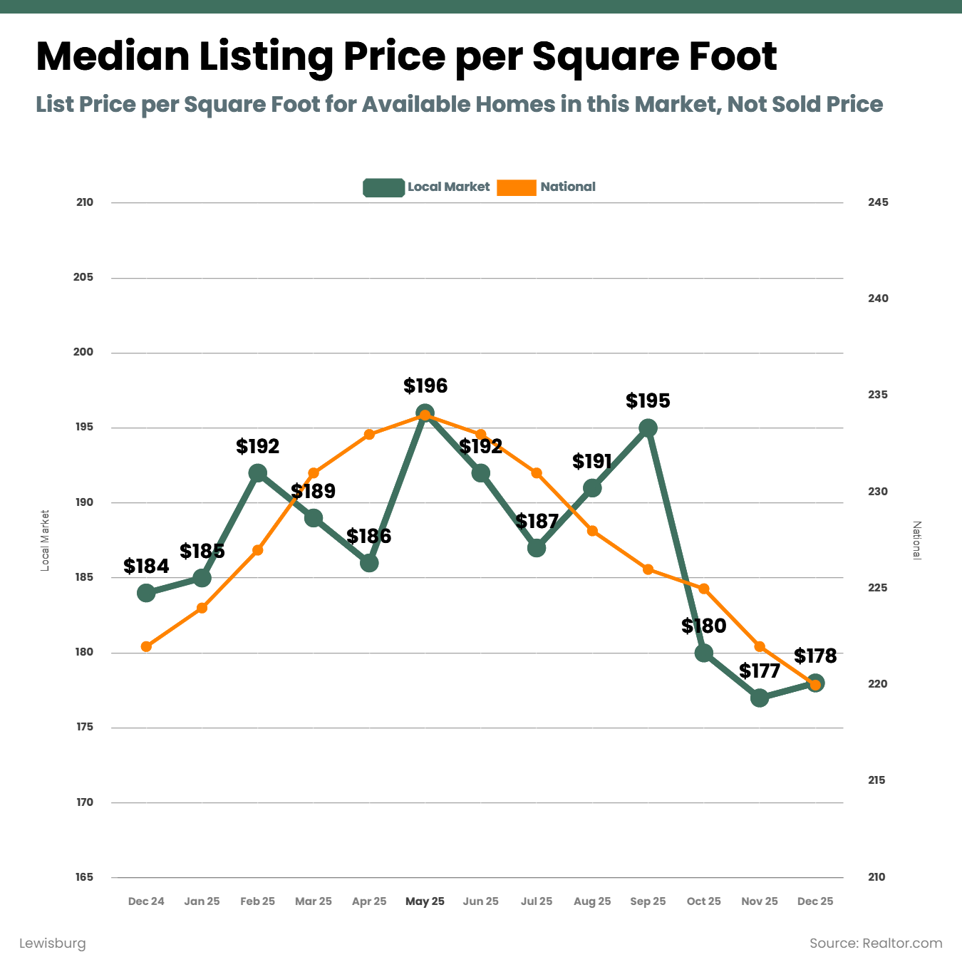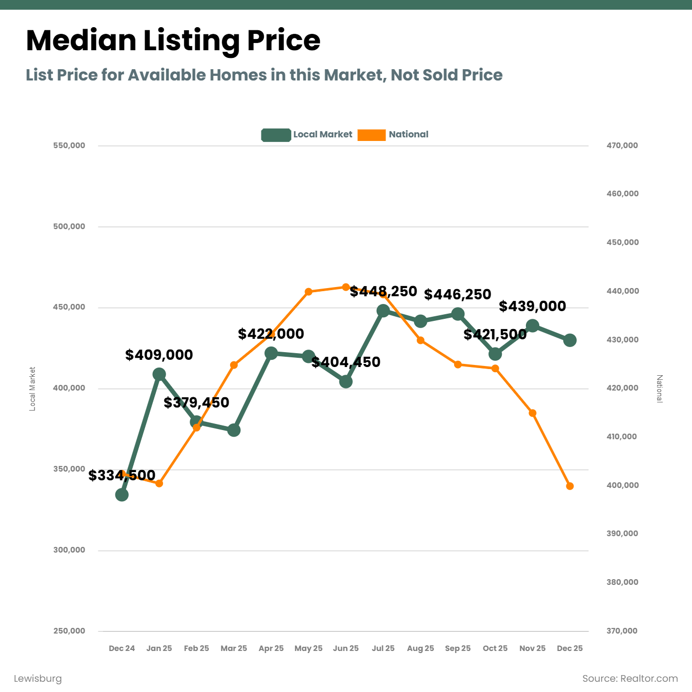 The median listing price in Lewisburg closed December around $430,000, down slightly from November. That month-to-month dip is notable, but the broader trend matters more.